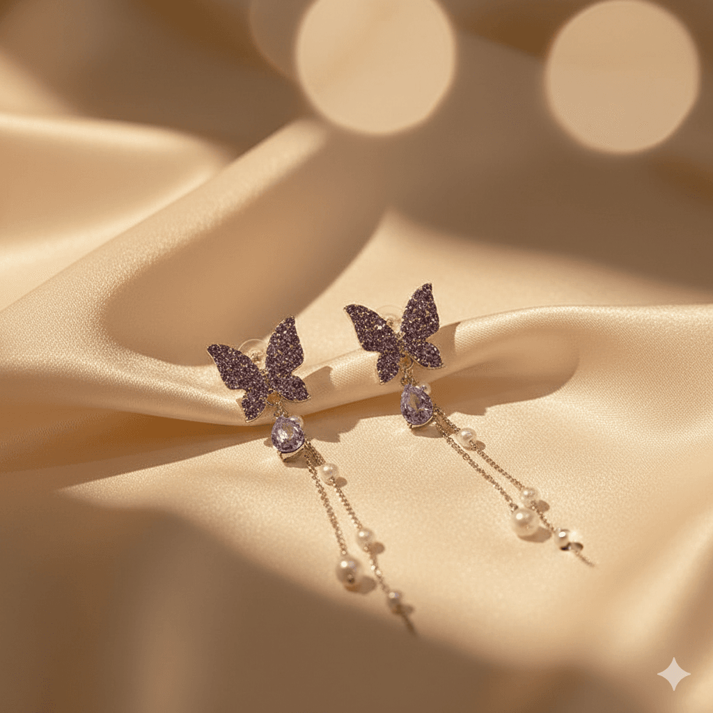 The intricate crystal detailing on the butterfly enhances its brilliance, while the lightweight structure ensures comfortable wear throughout the day. Whether styled for date nights, weddings, festive celebrations, parties, or elegant office events, these earrings instantly elevate your look with a touch of romantic luxury.