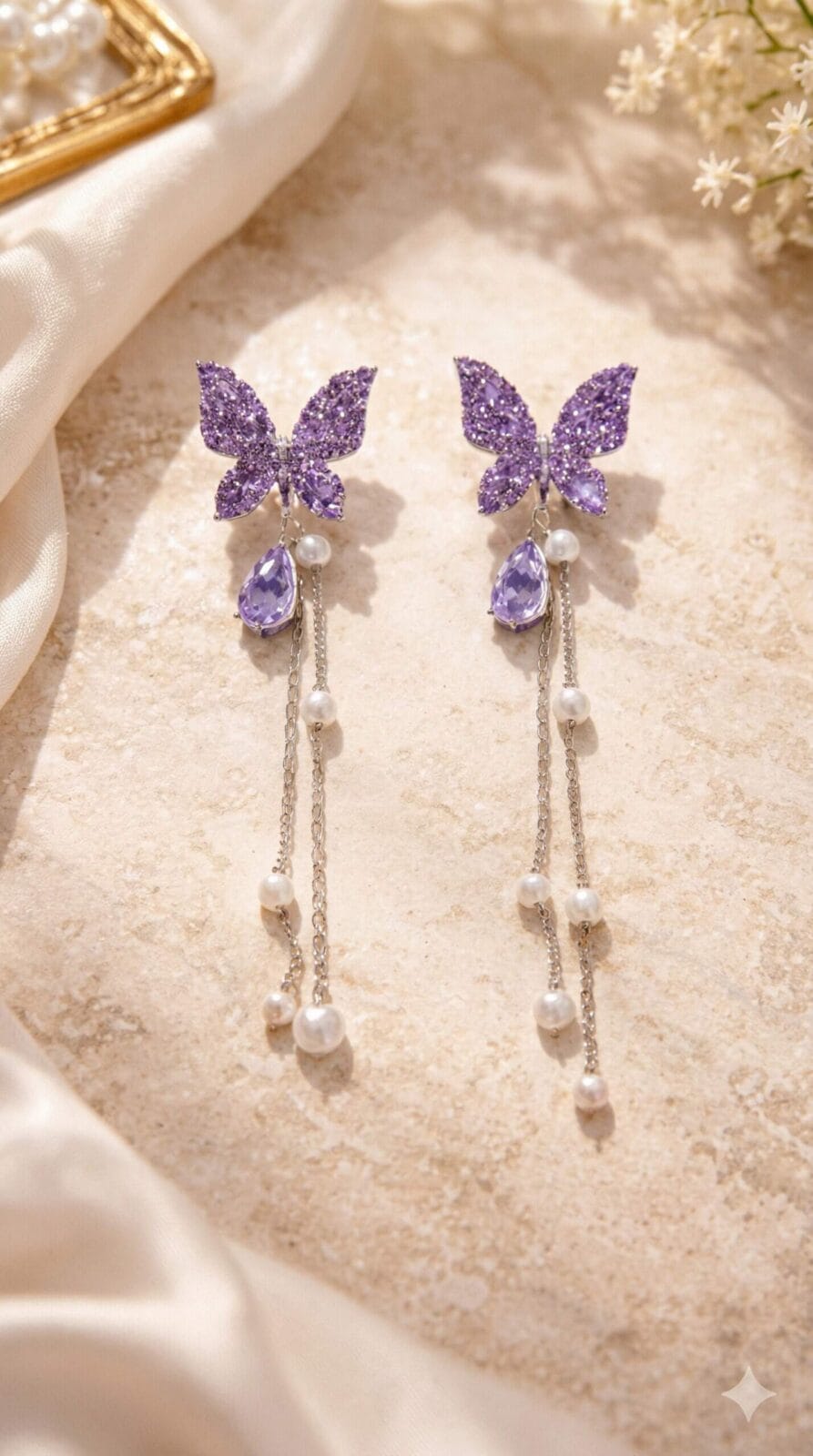 The combination of sparkling stones, flowing chains, and pearl drops makes these earrings a timeless yet trendy addition to any jewellery collection. Designed for women who appreciate graceful details and expressive style, the Eloria Butterfly Pearl Chain Drop Earrings reflect confidence, charm, and effortless elegance.