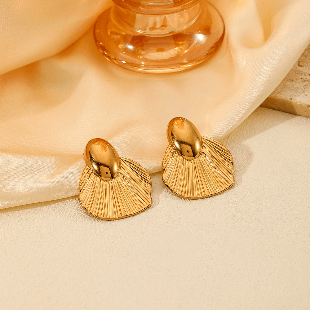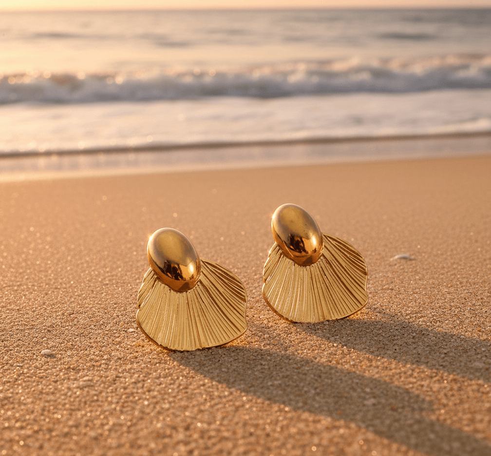 Golden shell statement stud earrings are a timeless expression of elegance inspired by the beauty of the ocean. Designed with a sculpted fan-shaped silhouette, these earrings reflect the natural curves of seashells while maintaining a bold, structured look. The smooth oval top blends seamlessly into the textured shell base, creating a balanced and refined finish.
