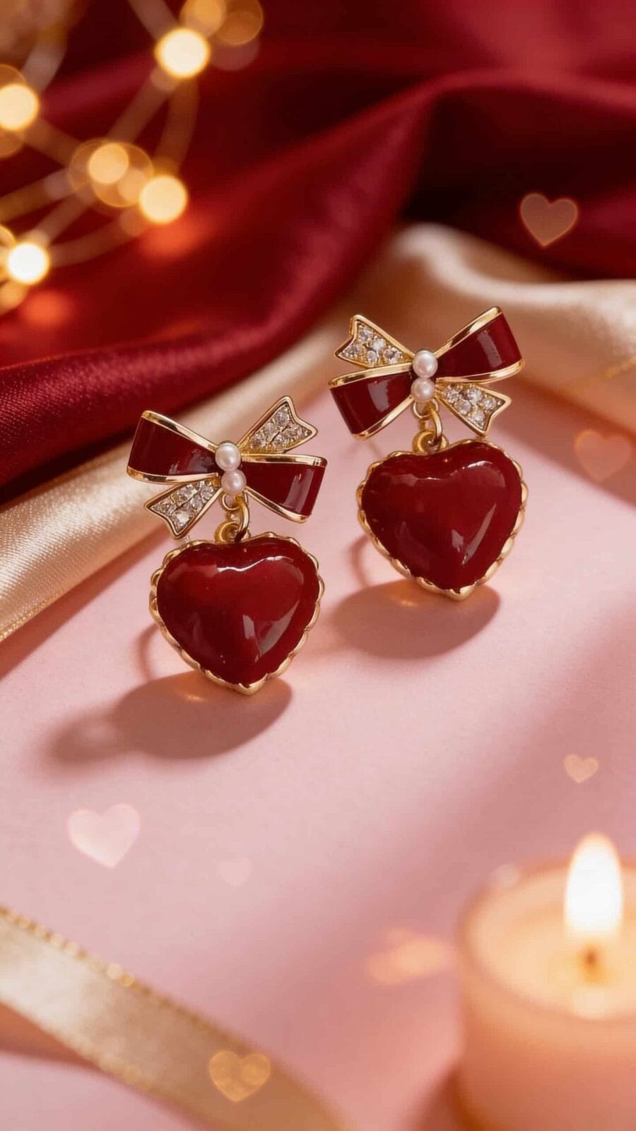 Red Heart Bow Gold Plated Earrings with Pearls and Crystals.
